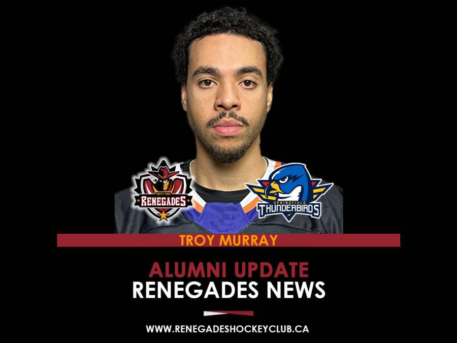 YOUR Renegades are excited to provide updates of our alumni continuing to pursue their hockey dream. Troy Murray has been called up to Springfield of the AHL.